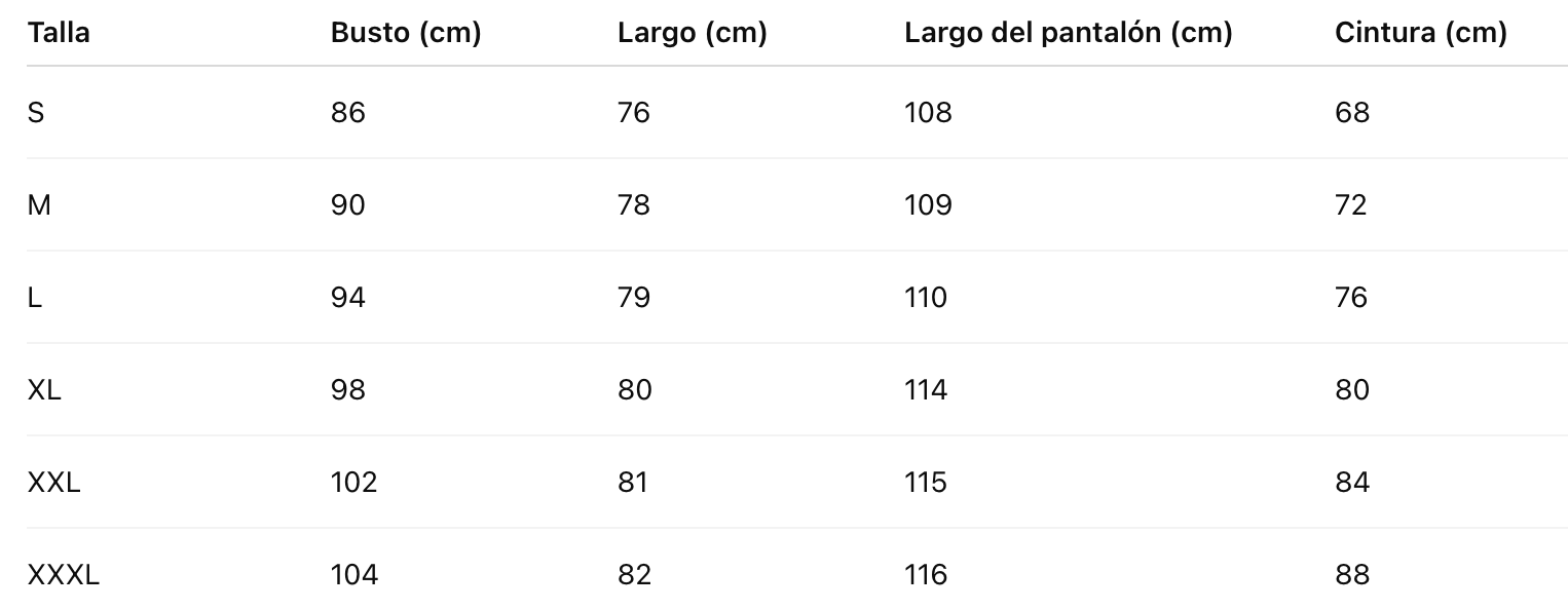 Talla Busto (cm) Largo (cm) Largo del pantalón (cm) Cintura (cm)