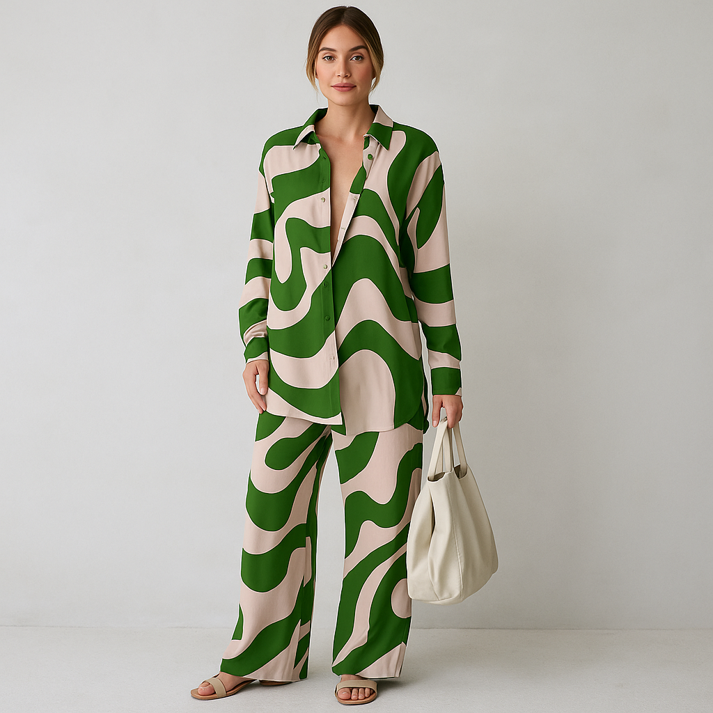 Este conjunto de dos piezas combina una camisa larga de corte fluido con pantalones holgados de estampado moderno, ofreciendo comodidad y estilo en un solo look. Perfecto para salidas casuales, viajes o un día relajado, su diseño versátil permite lucir sofisticada sin perder frescura. Ideal para mujeres que buscan un outfit cómodo y lleno de personalidad.