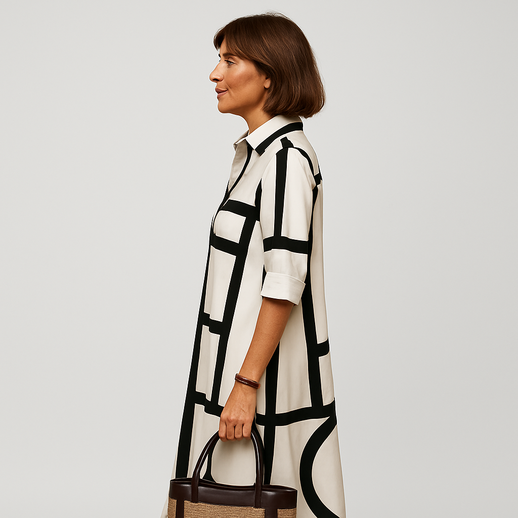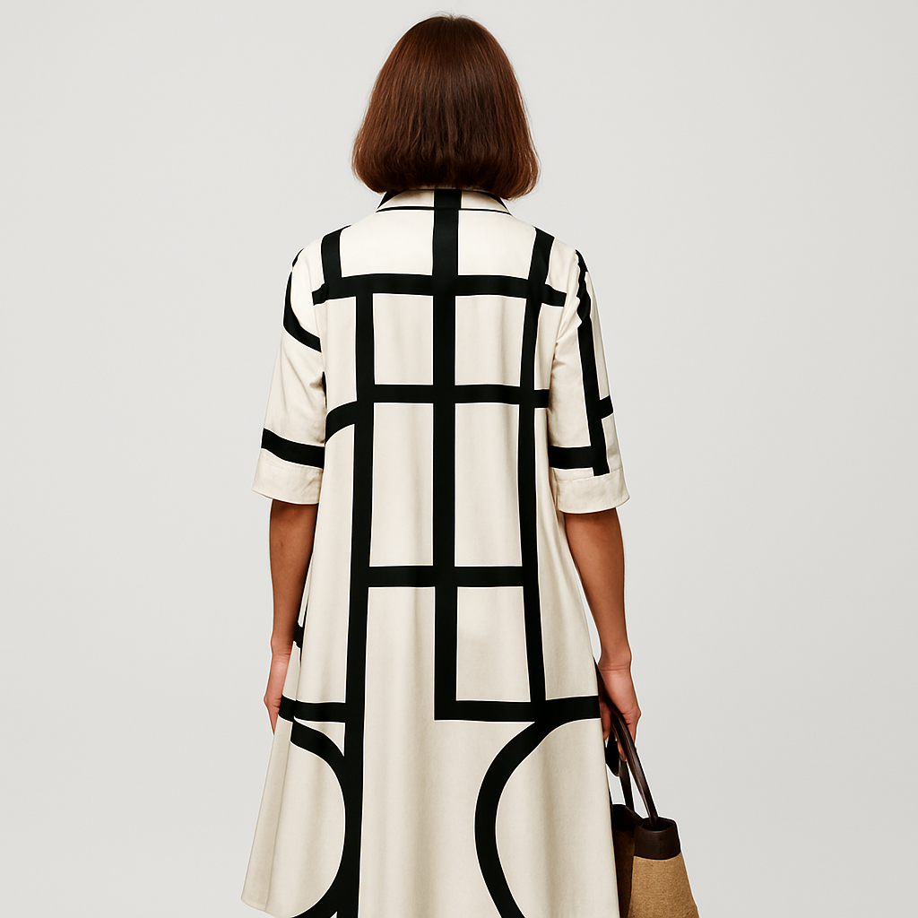 El estampado geométrico negro sobre fondo marfil ofrece un look audaz pero refinado que dice mucho sin necesidad de exagerar.